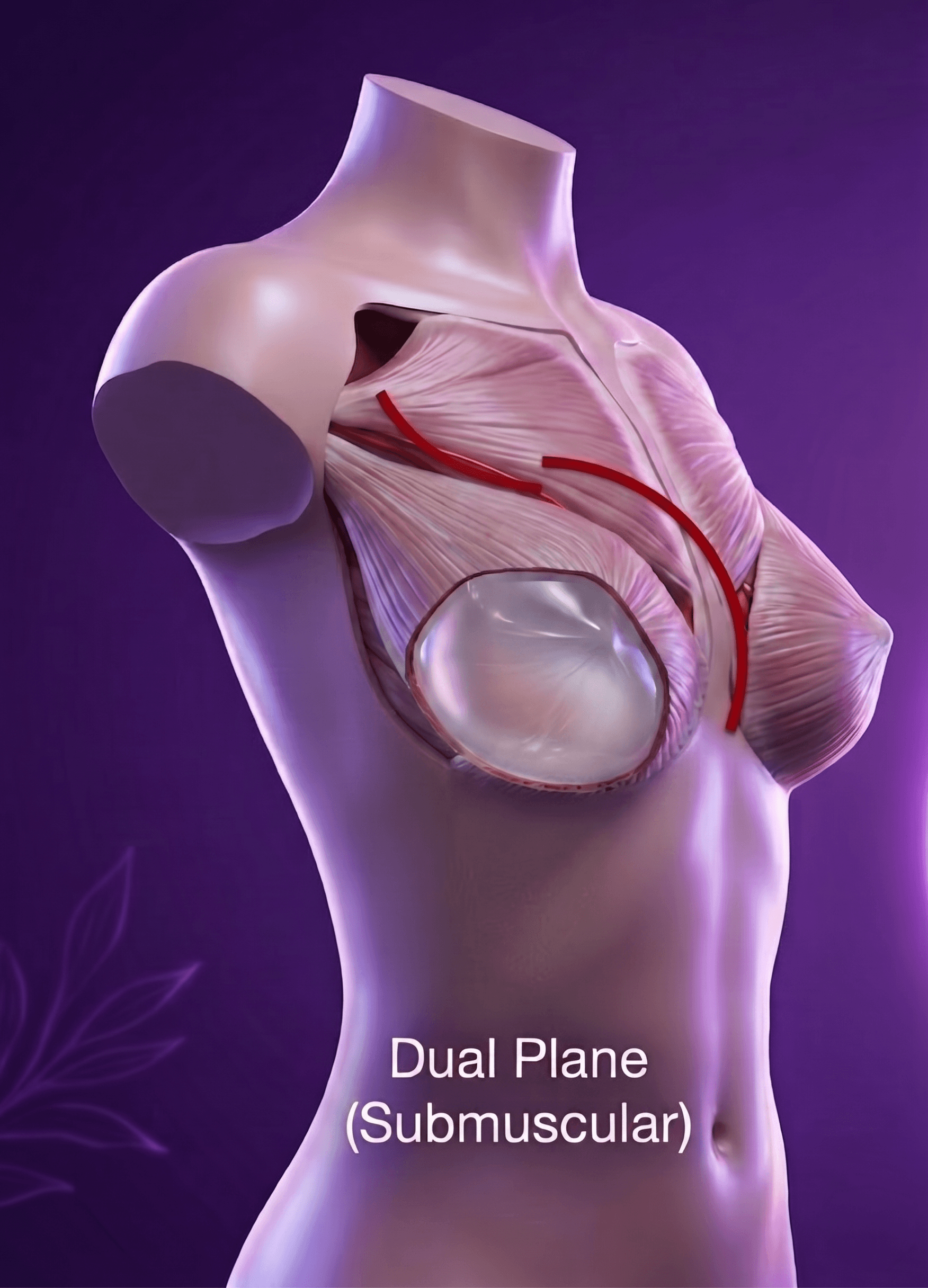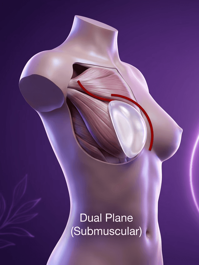 The implant is seated beneath the pectoralis major muscle. This generates a natural upper-pole slope, camouflages implant edges to reduce visible rippling, and lowers capsular contracture risks.