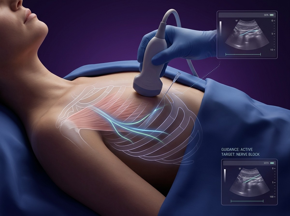 To ensure a virtually pain-free recovery, we perform highly targeted, ultrasound-guided regional nerve blocks (such as PECS blocks) while you are under general anesthesia. This advanced technique completely numbs the sensory nerves of the chest wall, meaning you will wake up experiencing zero surgical pain. This dramatically reduces the need for postoperative oral narcotics and accelerates your return to normal activities.